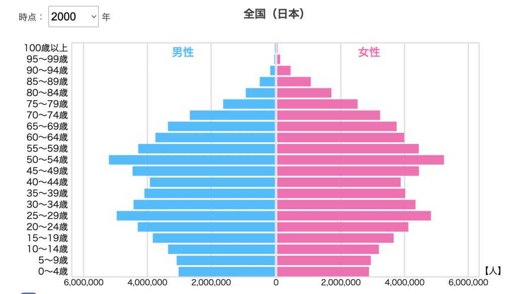 つまり、2000年で多かった年代がただ20年、年を重ねただけで新しい世代はどんどん減少しているのです。